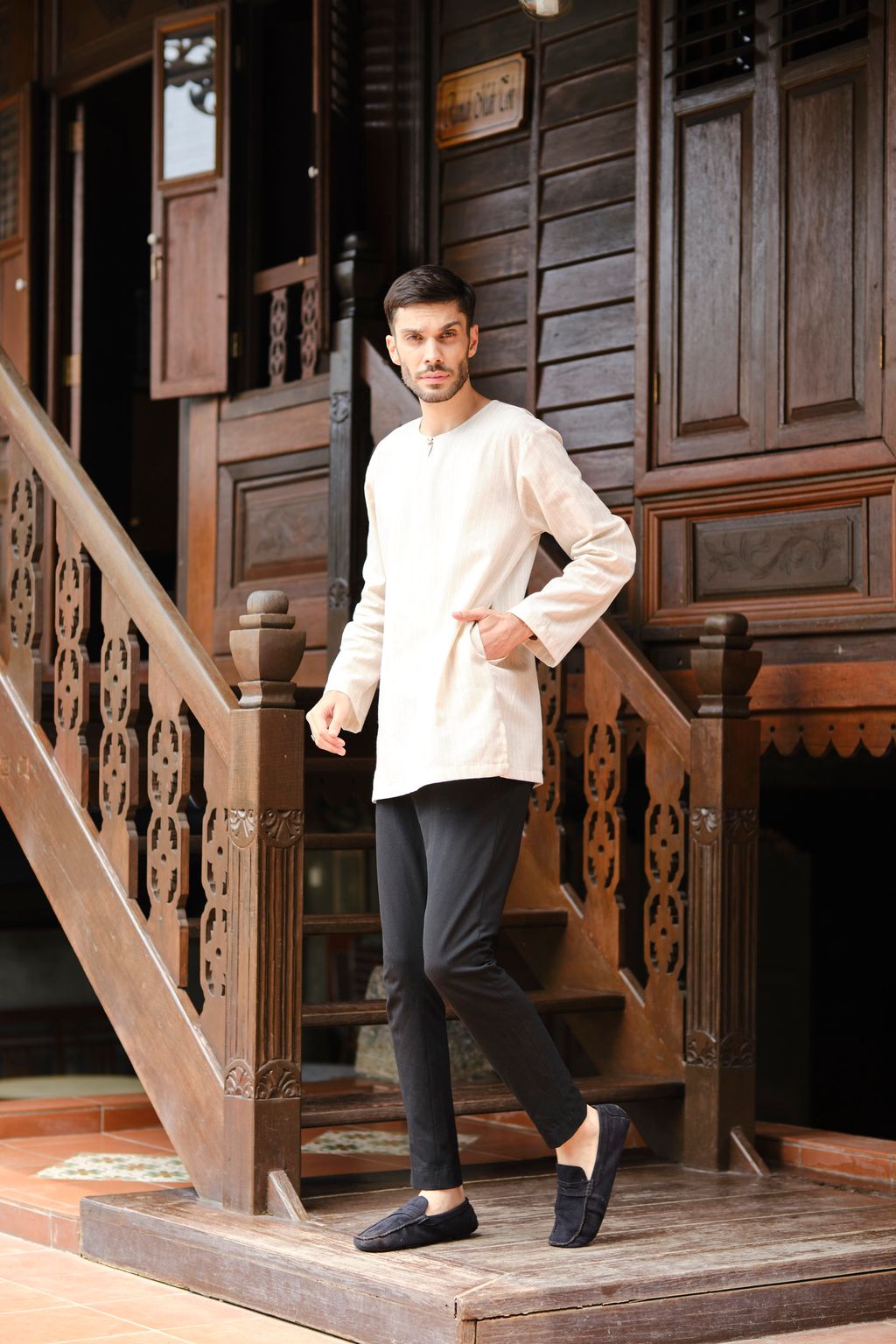 Aduka Kurta is a 100% linen kurta(available in teluk belanga and v-neck) in neutral coloured outfit that can easily match with any other colours. It’s a perfect, masculine and cooling Raya top for sons, fathers and grandfathers.
